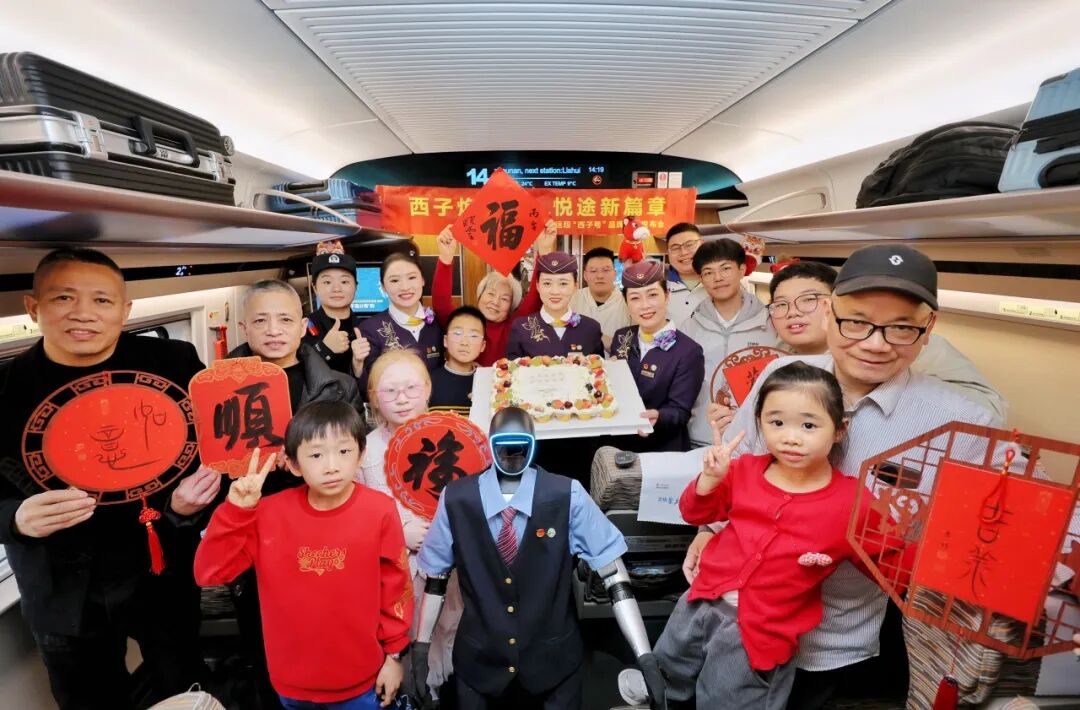 旅客在G41次列車上與機器人及乘務員合影。