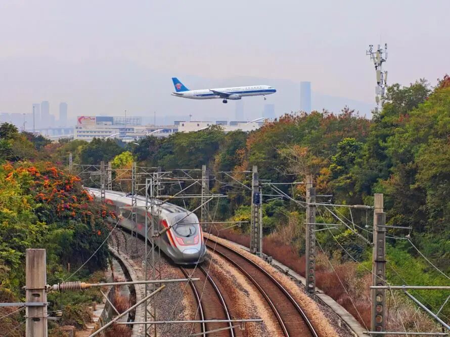廈門島內(nèi)鷹廈線路上,紅色復興號與藍色飛機同框。