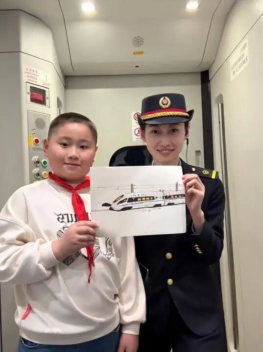系著紅領巾的小旅客,雙手捧著一幅自己手繪的高鐵畫,遞到了列車長面前。畫面上的列車線條流暢、細節(jié)生動,黑黃相間的車身仿佛正帶著少年的憧憬向前飛馳。列車長笑著接過這份沉甸甸的心意,與少年并肩站在一起,共同舉起畫作。