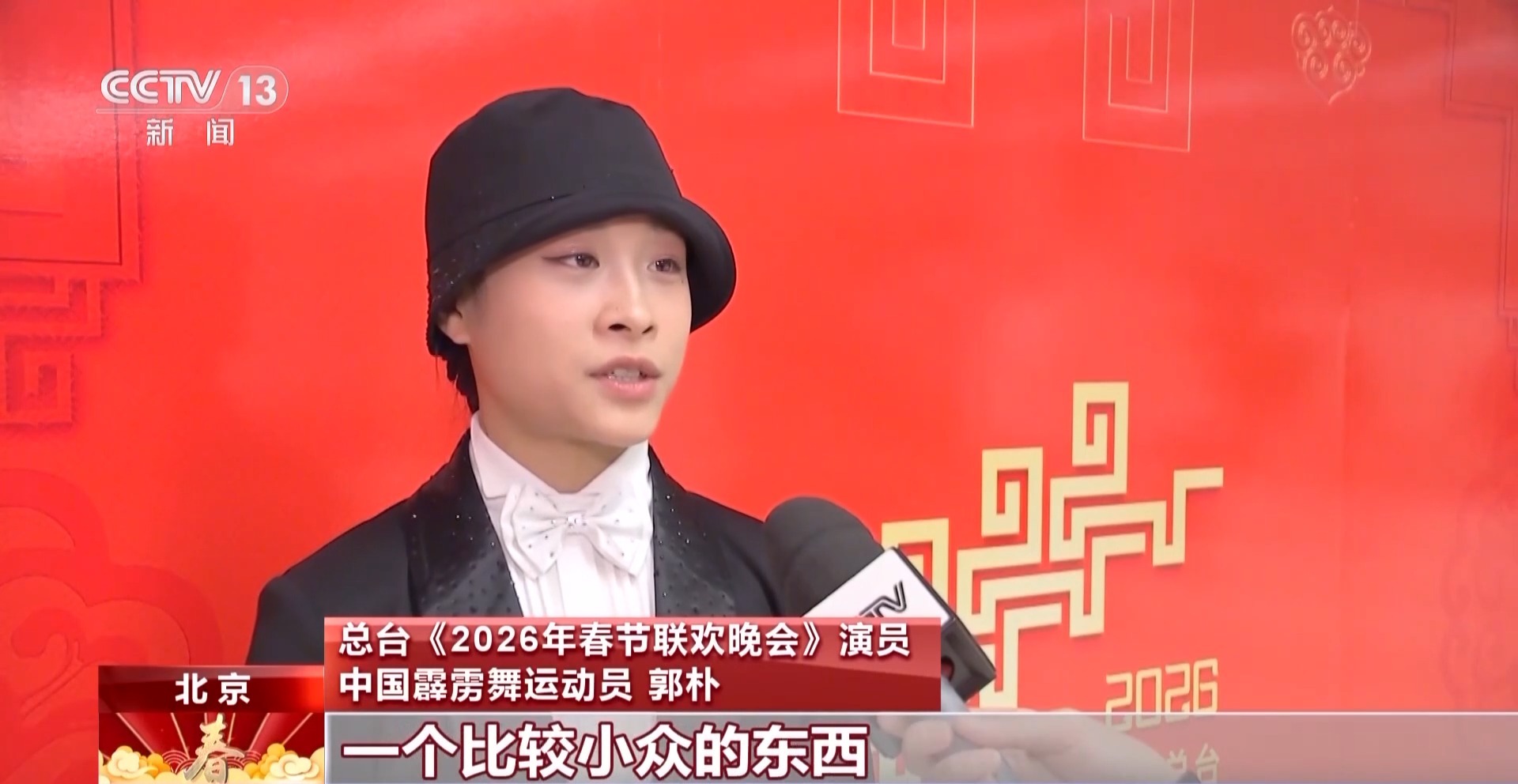 總臺(tái)《2026年春節(jié)聯(lián)歡晚會(huì)》演員 中國霹靂舞運(yùn)動(dòng)員 郭樸:這次在節(jié)目當(dāng)中做得最多的就是霹靂舞里面的一些技巧難度動(dòng)作,這是我第一次參加央視春晚,在春晚當(dāng)天讓大家看到霹靂舞,很開心,因?yàn)榕Z舞算是一個(gè)比較小眾的東西,它可以帶到全國人民的眼前,這個(gè)機(jī)會(huì)很難得。