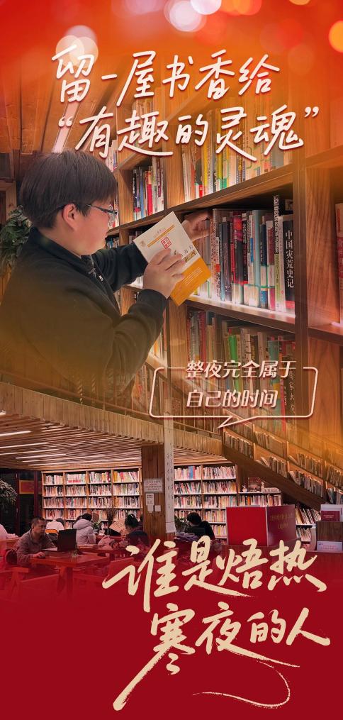 短短一個月,程澤鑫結識了很多“有趣的靈魂”——有一位白天在廚房“顛勺”的“書友”,嫌工作場所嘈雜,靜不下心,隔三岔五就來這里“泡”著,一讀就是一宿。有一回,程澤鑫見他讀得出神,水杯見底,便過去幫他續(xù)熱水,兩人就這么熟識了。