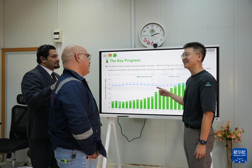 2月16日,在伊拉克瓦西特省艾哈代布油田,中國(guó)綠洲石油公司計(jì)劃部副經(jīng)理劉學(xué)(右一)與伊拉克合作伙伴梳理生產(chǎn)經(jīng)營(yíng)任務(wù)完成情況。新華社記者 段敏夫 攝