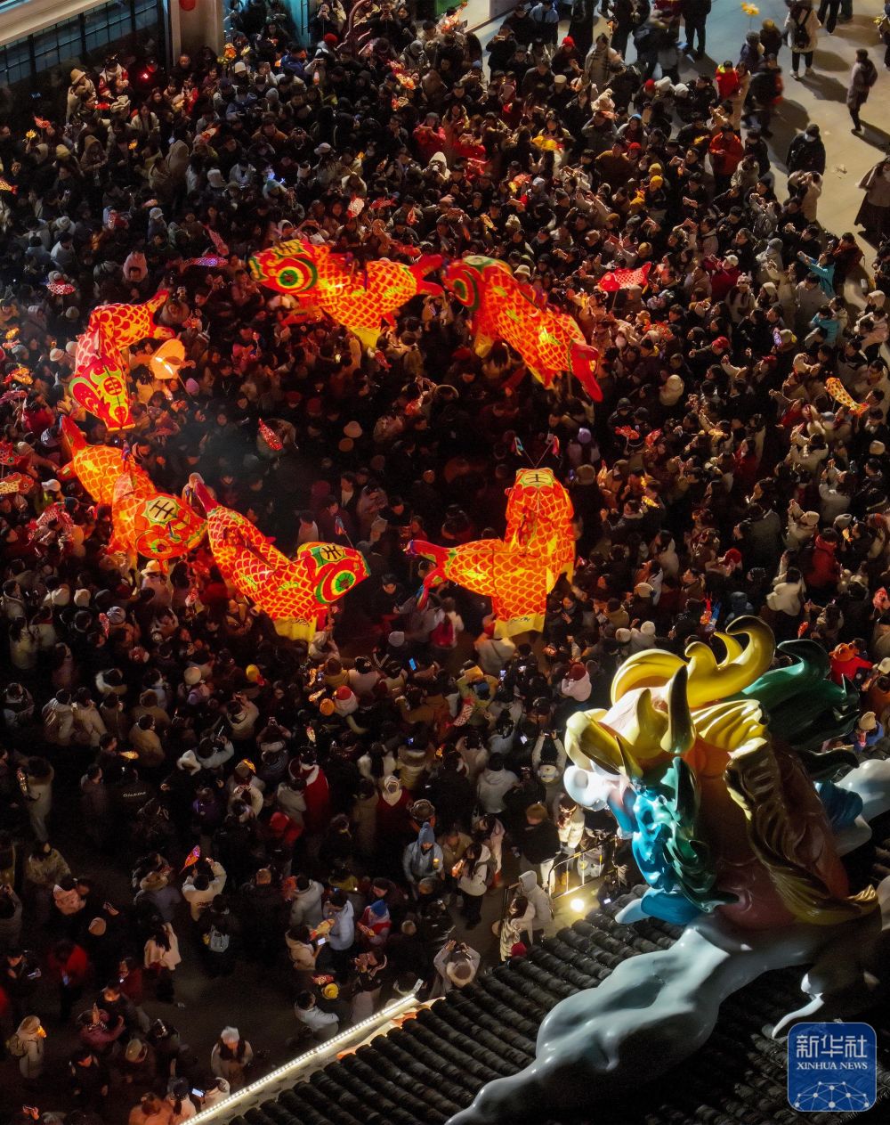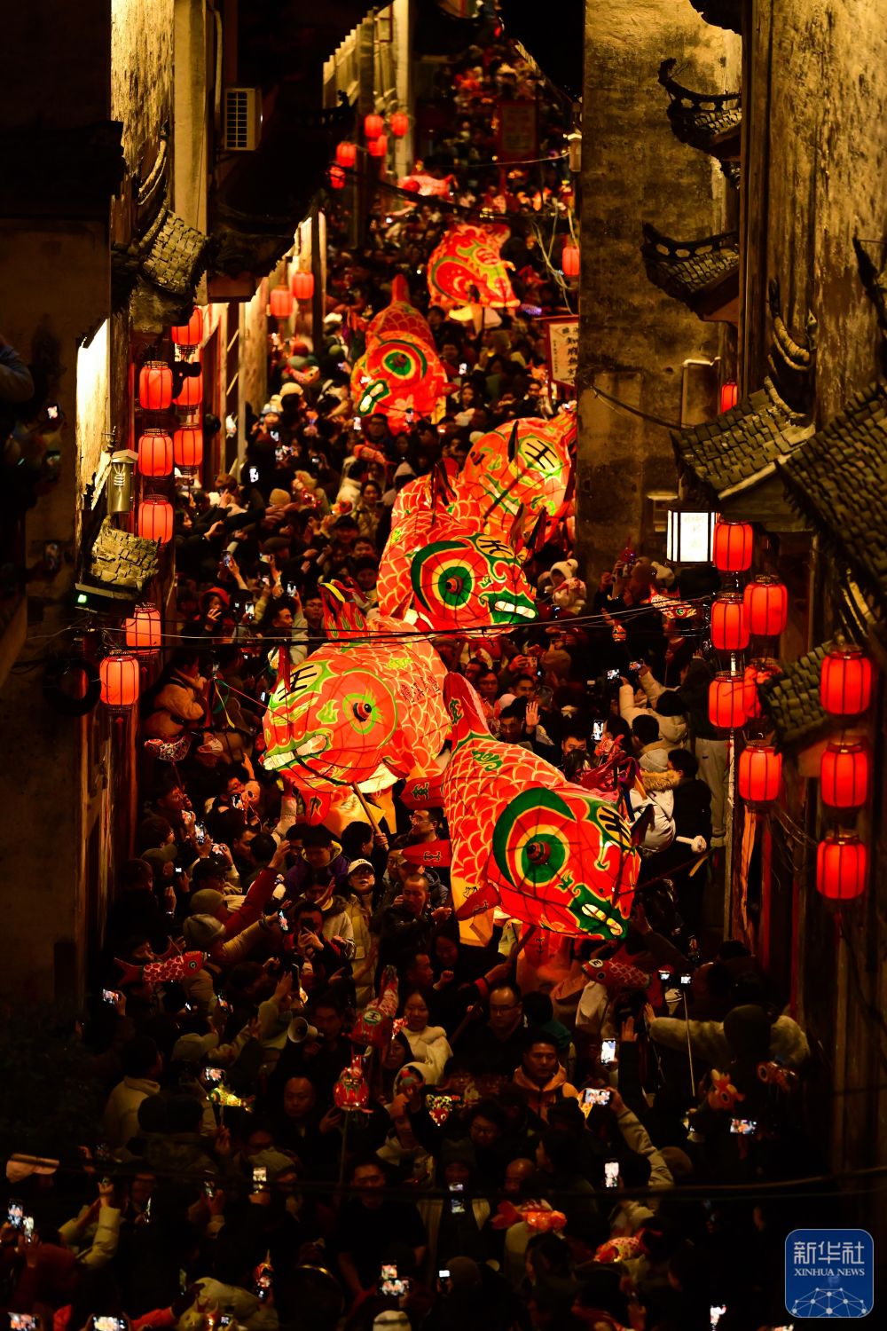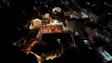 2月7日,瞻淇村魚燈隊在村中表演(無人機照片)。