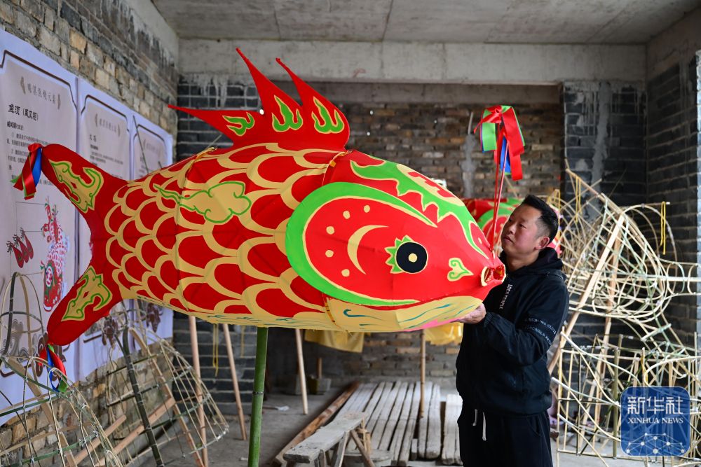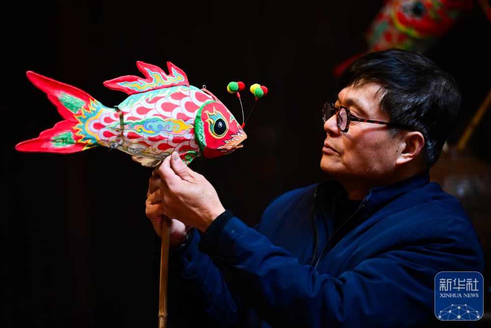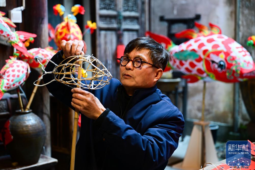 1月29日,瞻淇村的市級非遺項目魚燈代表性傳承人汪近午在制作魚燈。