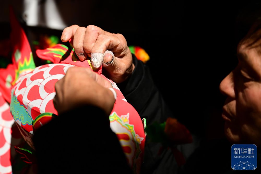 1月29日,瞻淇村的縣級非遺項目瞻淇魚燈代表性傳承人汪卓葷在制作魚燈。