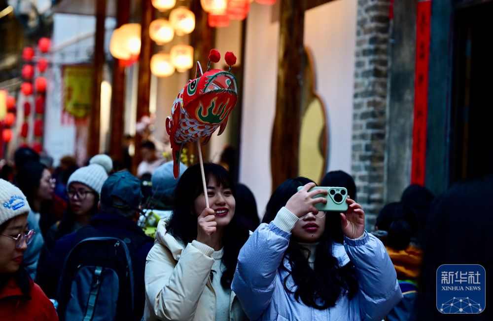2月7日,游客在瞻淇村里體驗魚燈表演。