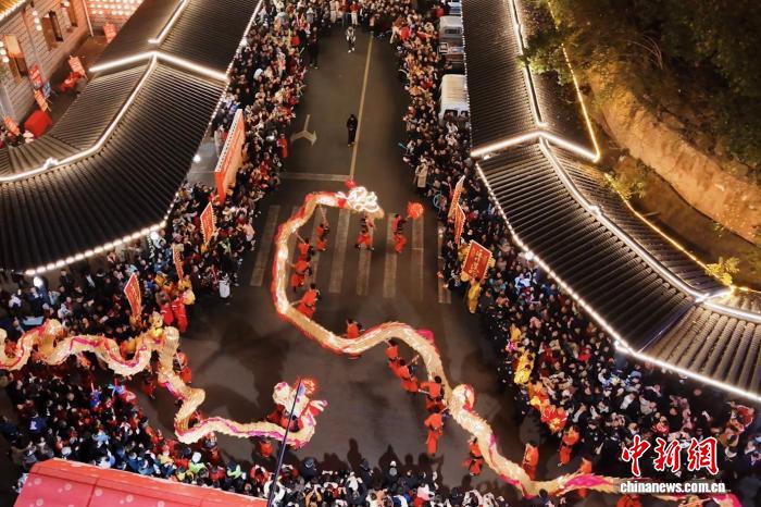 夜色中,鼓聲在街道上漸漸密集。伴隨著鼓點(diǎn),兩條金黃草龍翻騰而來,龍頭高昂,龍身起伏,數(shù)十名舞龍者腳步整齊,帶動(dòng)整條草龍如浪般滾動(dòng)。