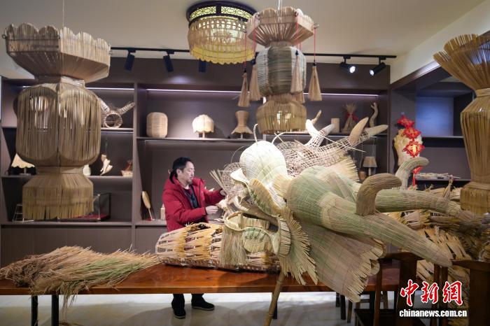 2026年春節(jié)假期期間,陳煥彬在工作室內(nèi)檢查草龍龍頭。 中新社記者 劉忠俊 攝