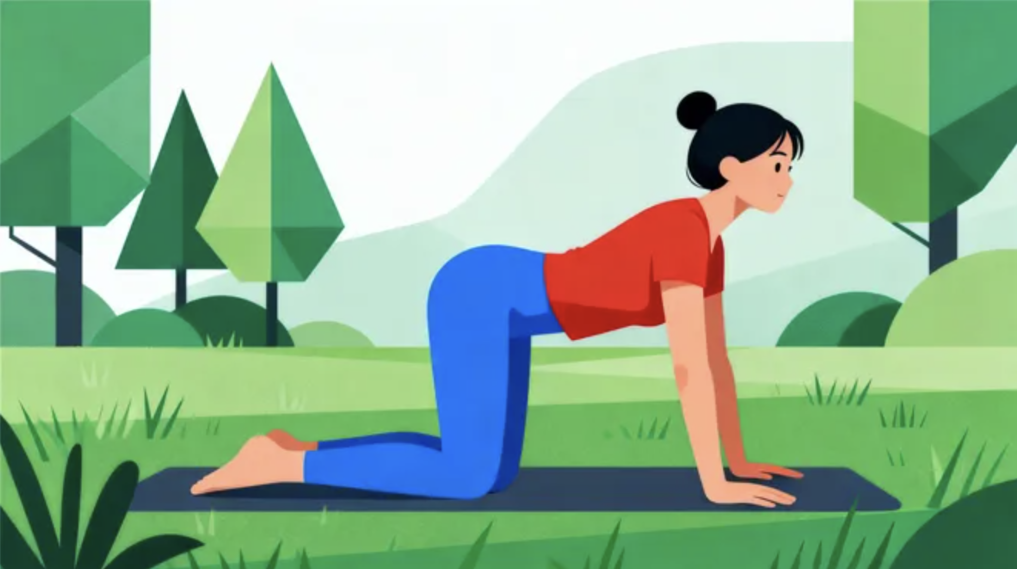1.懶貓弓背:跪姿,雙手雙膝撐地,手腕對(duì)齊肩膀,膝蓋對(duì)齊,保持背部平直;吸氣,抬頭塌腰,腹部下沉、臀部上翹,感受肩背腰部拉伸;呼氣,低頭拱背,下巴盡量靠近鎖骨,感受背部肌肉收縮,重復(fù)5-8次。