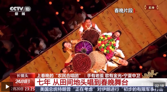 除夕夜,寧夏中衛(wèi)市中寧縣大戰(zhàn)場(chǎng)鎮(zhèn)農(nóng)民合唱團(tuán)登上央視春晚舞臺(tái),與廖昌永、鳳凰傳奇等知名歌手同臺(tái),用最質(zhì)樸的嗓音,唱出《來曬秋》的豐收喜悅。