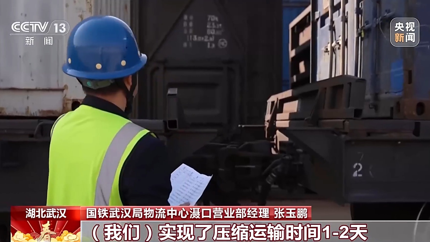 國鐵武漢局物流中心灄口營業(yè)部經(jīng)理 張玉鵬:現(xiàn)在貨量明顯上來了,很多企業(yè)開年第一批貨都集中在這幾天發(fā)運,每天發(fā)到3列左右。通過前置查驗、集拼集運、雙始發(fā)站聯(lián)動,我們實現(xiàn)了壓縮運輸時間1-2天、降低物流成本15%。