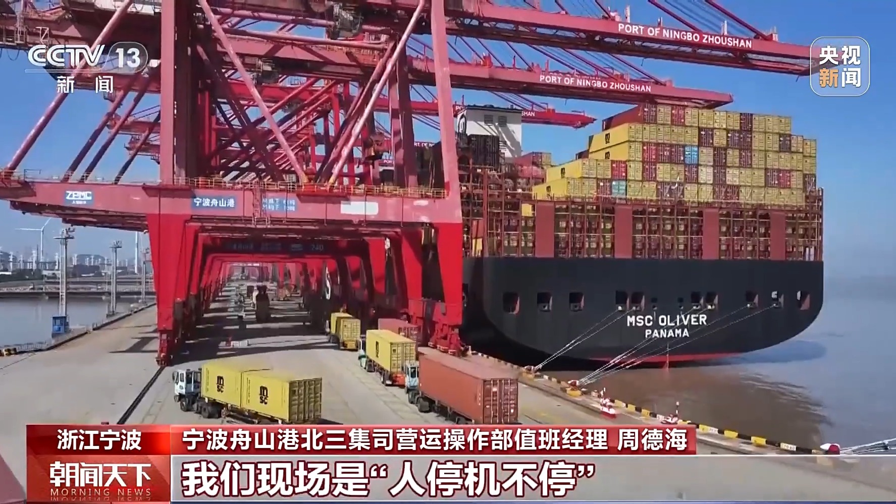 寧波舟山港北三集司營運操作部值班經(jīng)理 周德海:這條船載重量超過了19萬噸,這回在我們港區(qū)的作業(yè)量超過了兩萬標(biāo)準(zhǔn)箱,像這樣的船型,整個春節(jié)期間還是比較多的。這幾天出口箱量增長比較明顯,我們現(xiàn)場是“人停機不?!?。節(jié)后的第一波出口集中,客戶都希望搶時間、趕船期,我們也爭分奪秒確保貨物能及時出運。