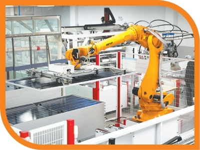 江蘇省淮安市洪澤區(qū)新源太陽能科技有限公司,工業(yè)機器人在生產(chǎn)太陽能光伏組件。