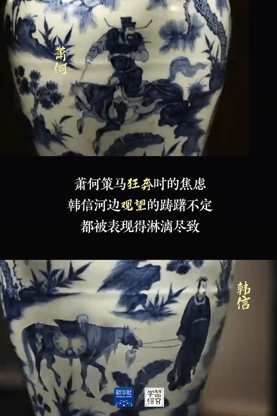 “元代是中國陶瓷史上不容忽視的重要時(shí)期?!彼窝嘟榻B,這件藏于南京市博物館的元青花蕭何月下追韓信圖梅瓶向人們展示了元代制瓷水平。