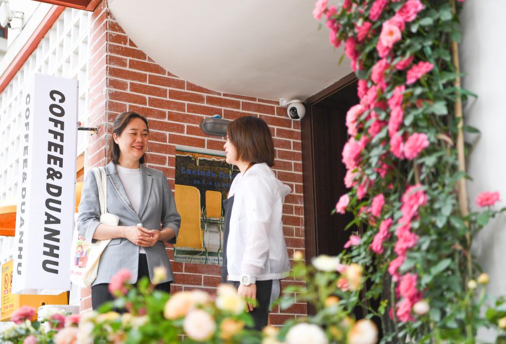 4月23日,伍成莉與社區(qū)內店鋪工作人員交談。