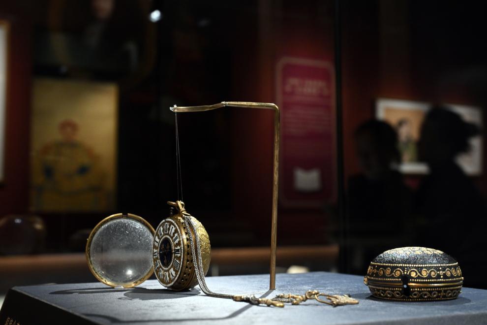 這是展出的故宮博物院藏銅鍍金殼開光人物像懷表。2024年4月1日,作為中法文化旅游年的重要項目,“紫禁城與凡爾賽宮——17、18世紀的中法交往”展覽開幕式在北京故宮文華殿舉行,展出大約200件文物精品。(新華社記者金良快攝)