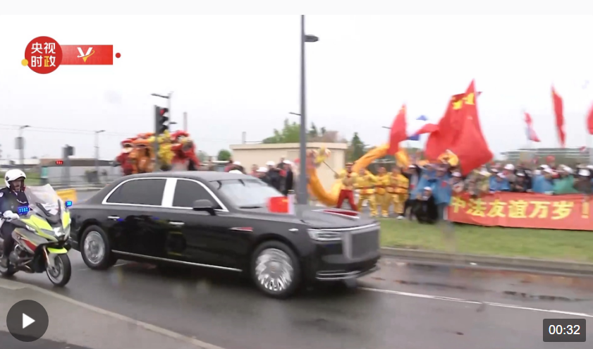 當?shù)貢r間5月5日下午,國家主席習近平乘專機抵達巴黎。從機場前往下榻酒店途中,包括華人華僑和中國留學生代表在內(nèi)的歡迎人群揮舞著中法兩國國旗,敲鑼打鼓,舞龍舞獅,熱烈歡迎習近平主席到訪。