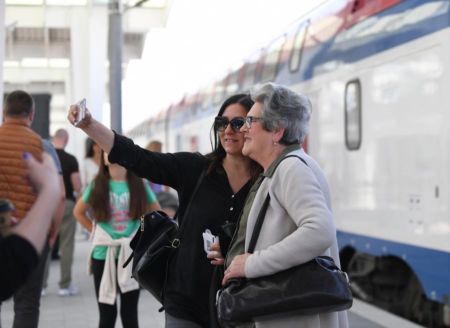 2023年5月6日,在塞爾維亞諾維薩德火車站,乘客在開(kāi)往貝爾格萊德的列車前自拍。新華社記者任鵬飛攝