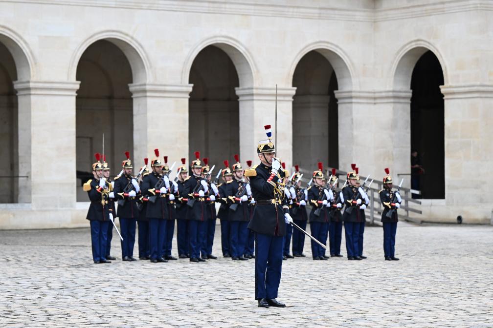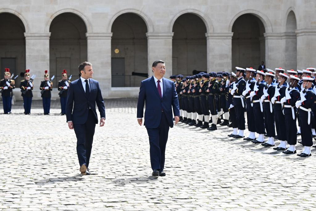 當天下午,習近平在巴黎出席馬克龍舉行的隆重盛大歡迎儀式。兩國元首檢閱法蘭西共和國衛(wèi)隊和陸??杖妰x仗隊,并觀看分列式。