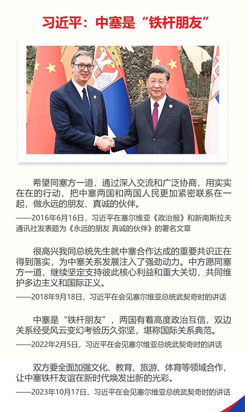 這是時(shí)隔近八年,習(xí)主席再次對(duì)塞爾維亞進(jìn)行國(guó)事訪(fǎng)問(wèn)。中塞是“鐵桿朋友”,習(xí)主席指出,希望同塞方一道,通過(guò)深入交流和廣泛協(xié)商,用實(shí)實(shí)在在的行動(dòng),把中塞兩國(guó)和兩國(guó)人民更加緊密聯(lián)系在一起,做永遠(yuǎn)的朋友、真誠(chéng)的伙伴。