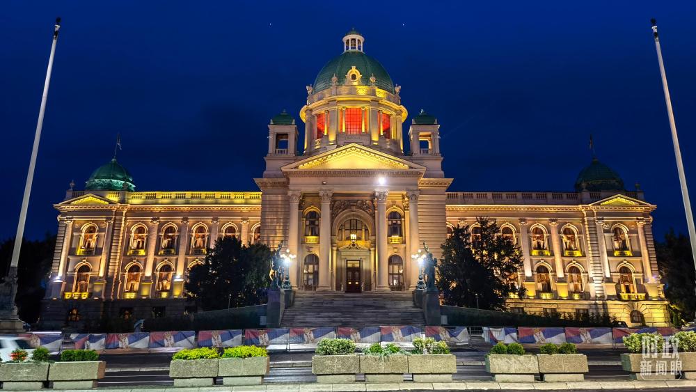 塞爾維亞國會大廈亮起紅燈,歡迎習(xí)主席到訪。(總臺央視記者石丞拍攝)