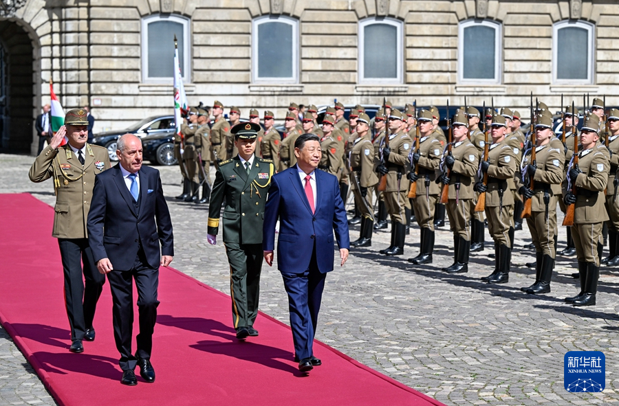 當(dāng)?shù)貢r(shí)間5月9日上午,國(guó)家主席習(xí)近平在布達(dá)佩斯出席匈牙利總統(tǒng)舒尤克和總理歐爾班共同舉行的隆重歡迎儀式。這是習(xí)近平在舒尤克陪同下檢閱儀仗隊(duì)。新華社記者 殷博古 攝