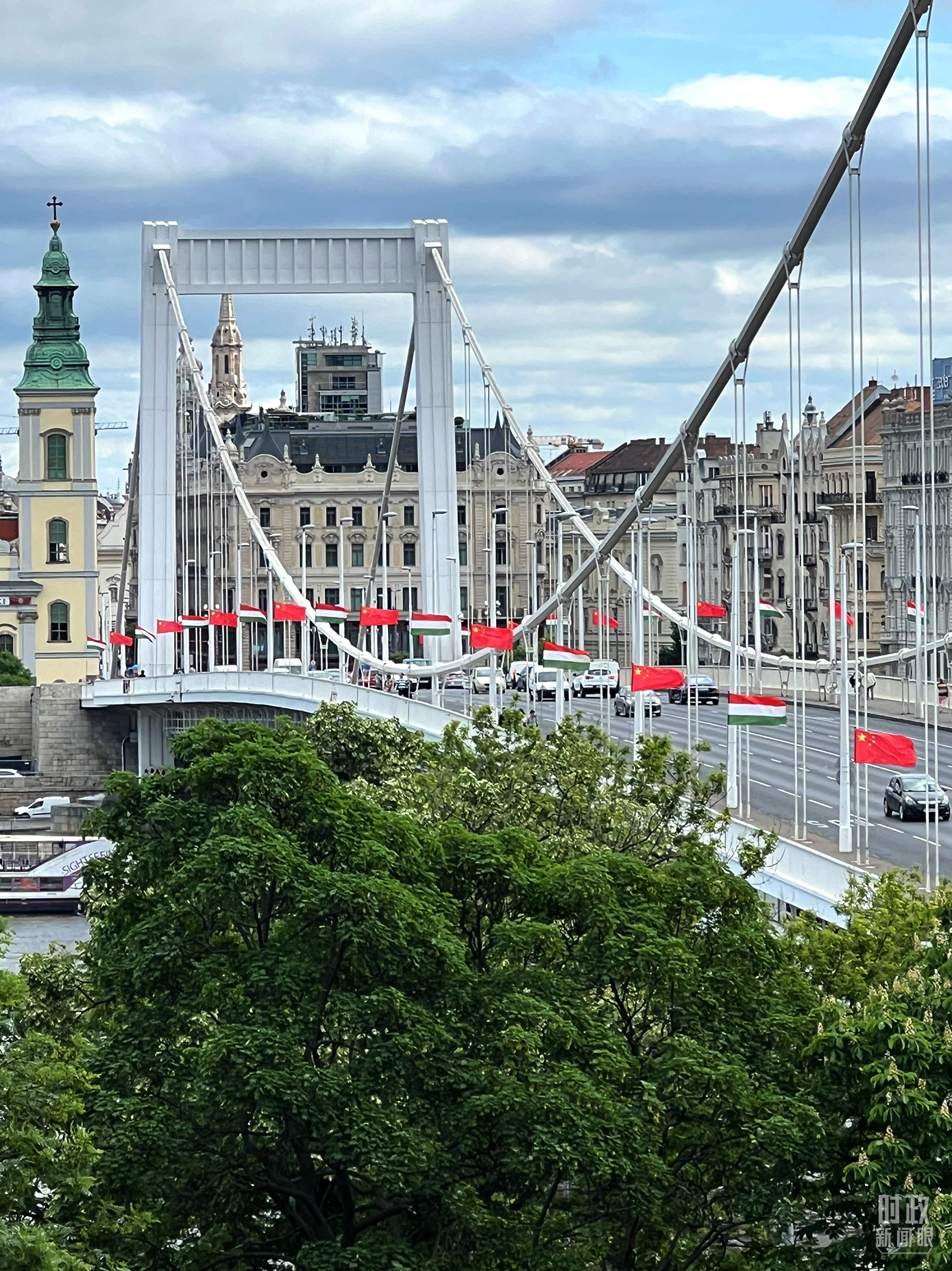 懸掛中匈兩國國旗的布達(dá)佩斯伊麗莎白大橋。(總臺央視記者石偉明拍攝)