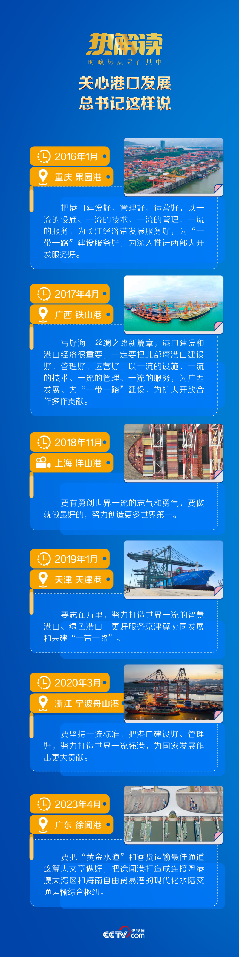 總書記曾深刻指出:“經(jīng)濟(jì)強(qiáng)國(guó)必定是海洋強(qiáng)國(guó)、航運(yùn)強(qiáng)國(guó)?!彼M覈?guó)港口建設(shè)“要志在萬(wàn)里”,“為國(guó)家發(fā)展作出更大貢獻(xiàn)”。