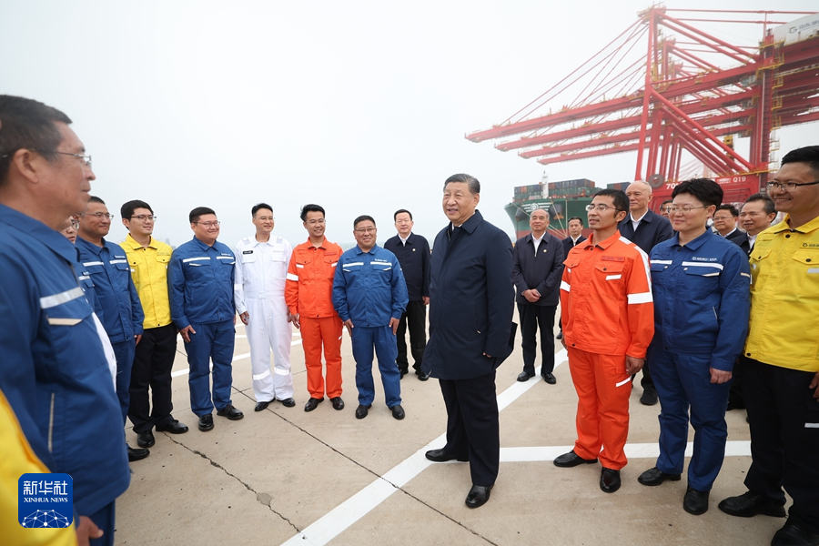 5月22日至24日,中共中央總書記、國家主席、中央軍委主席習近平在山東考察。這是22日下午,習近平在日照港親切慰問港口科技工作者、運營人員、航運人員。新華社記者 謝環(huán)馳 攝