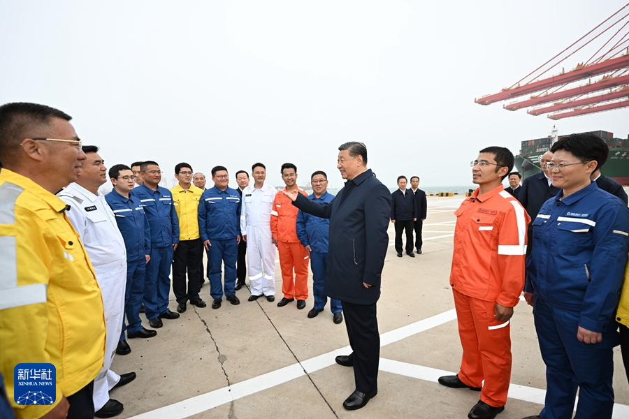 5月22日至24日,中共中央總書記、國家主席、中央軍委主席習近平在山東考察。這是22日下午,習近平在日照港親切慰問港口科技工作者、運營人員、航運人員。新華社記者 鞠鵬 攝