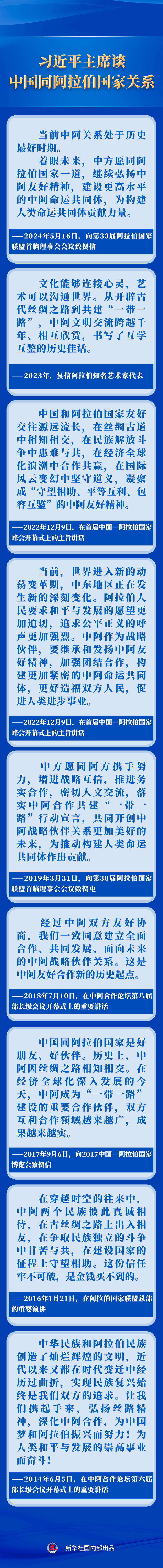 近年來,習(xí)近平主席就中國同阿拉伯國家關(guān)系作出一系列重要論述,指引中阿關(guān)系持續(xù)向前發(fā)展。
