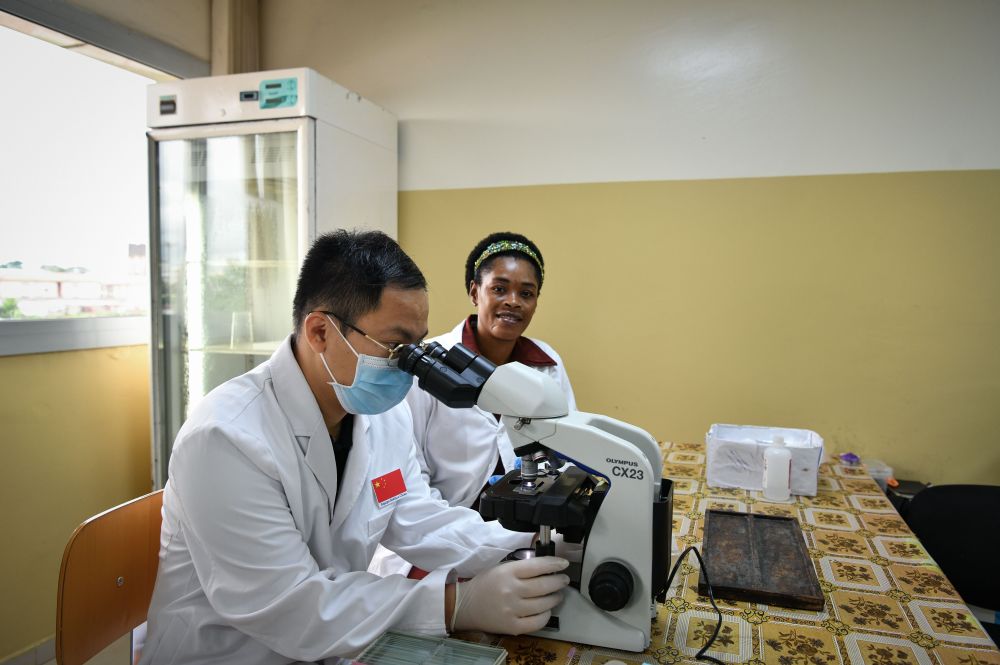 5月16日,在赤道幾內(nèi)亞馬拉博地區(qū)醫(yī)院,中國醫(yī)生同當?shù)赝乱黄饳z測樣本。