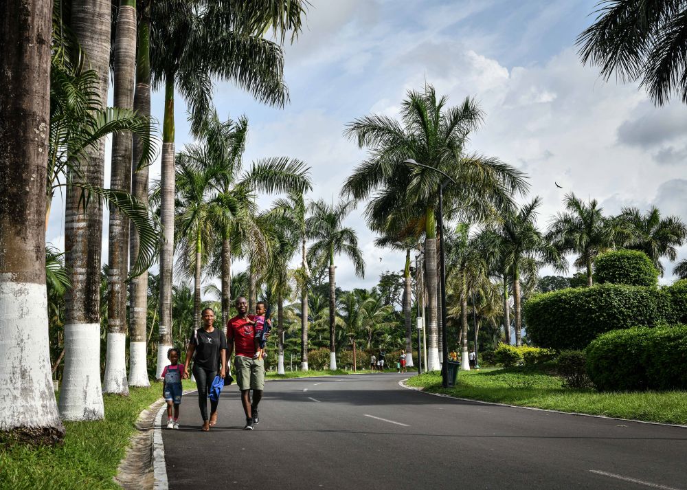 5月19日,在赤道幾內(nèi)亞首都馬拉博,當?shù)鼐用裨谥袊髽I(yè)承建的馬拉博國家公園里散步。