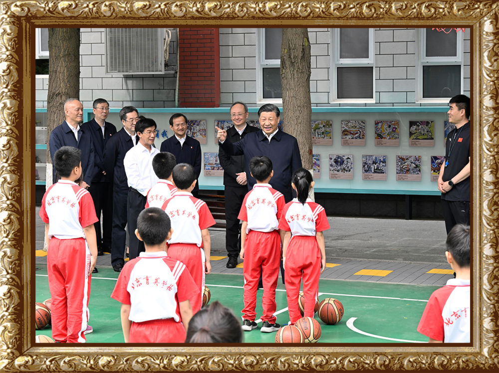 2023年5月31日上午,習(xí)近平總書記來到北京育英學(xué)??赐繂枎熒诨@球場(chǎng)同正在上體育課的小學(xué)生們親切交流。習(xí)近平親切地說:“現(xiàn)在生活條件好了,孩子們不是要吃得胖胖的,而是要長(zhǎng)得壯壯的、練得棒棒的?!?/strong>