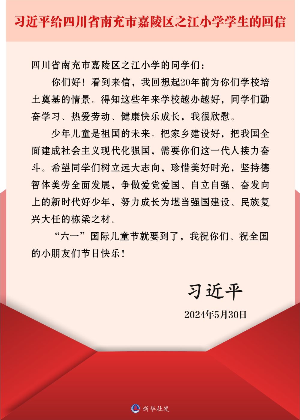 在“六一”國際兒童節(jié)即將到來之際,中共中央總書記、國家主席、中央軍委主席習(xí)近平5月30日給四川省南充市嘉陵區(qū)之江小學(xué)的學(xué)生們回信,對他們予以親切勉勵,并祝他們和全國的少年兒童節(jié)日快樂。