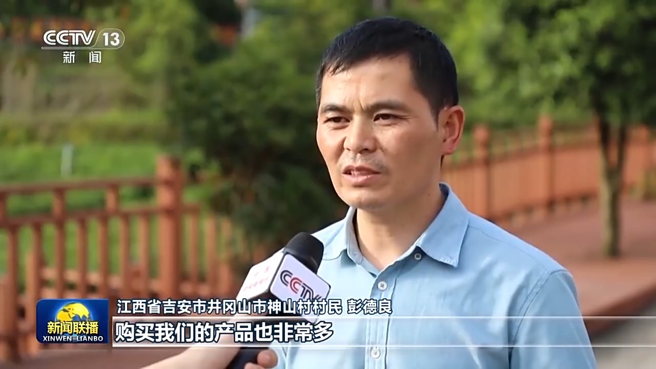 江西省吉安市井岡山市神山村村民 彭德良:游客越來(lái)越多,購(gòu)買(mǎi)我們的產(chǎn)品也非常多,給我們?cè)黾恿撕艽蟮氖杖搿?/p>