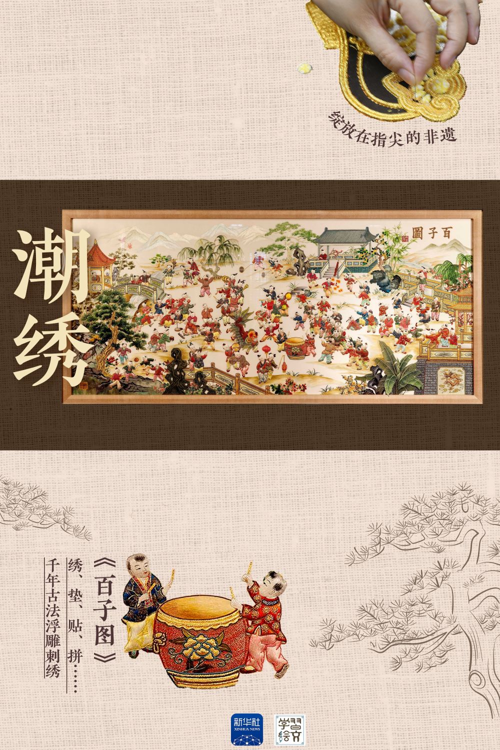 《百子圖》潮繡屏風(fēng)構(gòu)圖飽滿、均衡對稱,一百位童子或顰或喜、或斗蟀踢球、或敲鑼打鼓,形態(tài)各異、生動傳神,是一幅高貴典雅的民間藝術(shù)珍品。