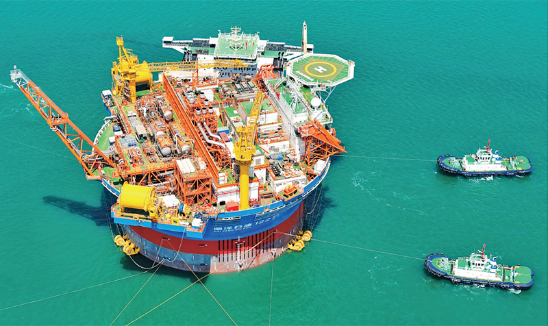 “??惶?hào)”,是亞洲首艘圓筒型浮式生產(chǎn)儲(chǔ)卸油裝置。該裝置集原油生產(chǎn)、存儲(chǔ)、外輸?shù)裙δ苡谝惑w,被網(wǎng)友們昵稱(chēng)為“超級(jí)能源碗”,也是完全由我國(guó)自主設(shè)計(jì)建造的海上油氣加工廠。圖為2024年5月12日,“??惶?hào)”從中國(guó)海油青島國(guó)際化高端裝備制造基地離港啟運(yùn)。 人民圖片 張進(jìn)剛/攝