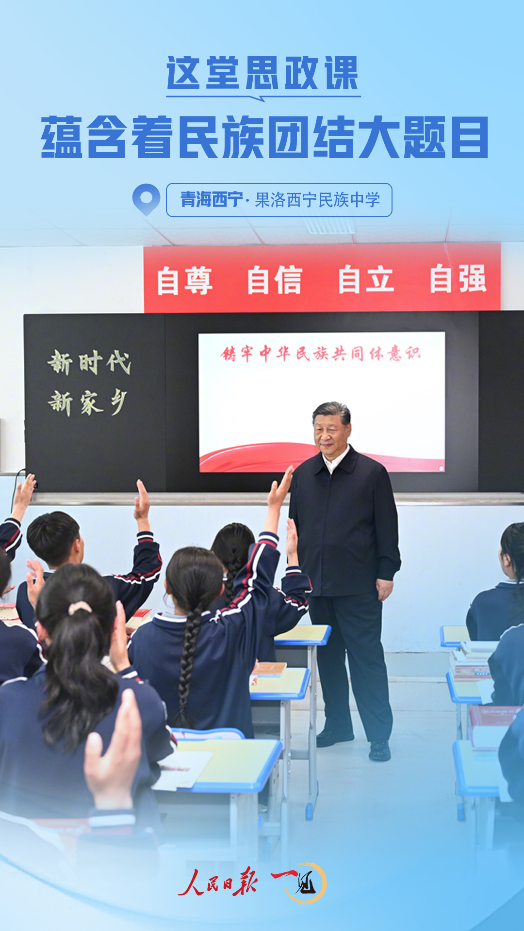 西寧城北,元朔山麓,藍(lán)天白云掩映下的果洛西寧民族中學(xué)綠意蔥蘢。6月18日,正在青海省西寧市考察的習(xí)近平總書記來到這里并觀摩了一堂思政課??倳泴?duì)思政課歷來很重視——這是落實(shí)立德樹人根本任務(wù)的關(guān)鍵課程,是培養(yǎng)社會(huì)主義建設(shè)者和接班人的重要保障。