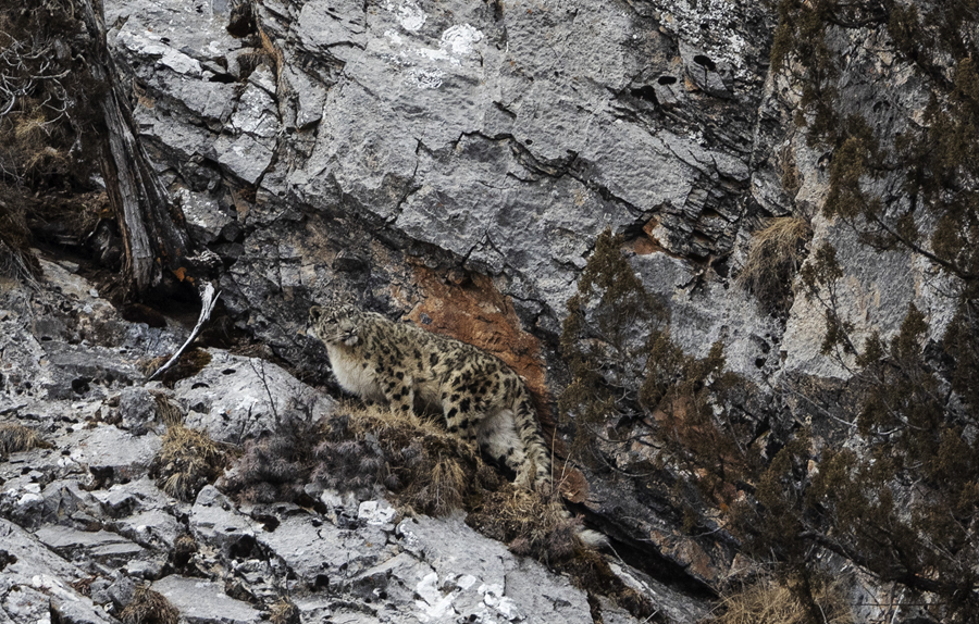 2023年2月21日,在青海省玉樹藏族自治州雜多縣昂賽鄉(xiāng)境內(nèi)的昂賽大峽谷內(nèi),一只雪豹準備向上攀爬。新華社記者 費茂華 攝