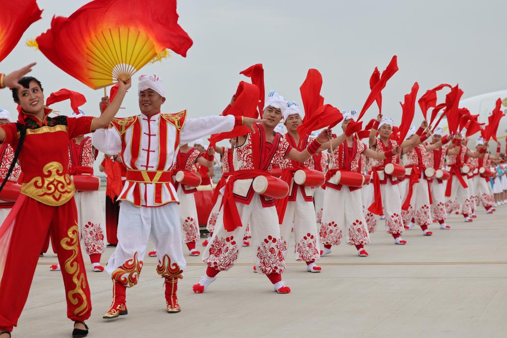2023年5月17日下午,出席中國-中亞峰會的哈薩克斯坦總統(tǒng)托卡耶夫抵達陜西省西安市。當地民眾以熱情的腰鼓、歡快的秧歌等民間藝術表演歡迎貴賓到來。新華社記者 邢廣利 攝