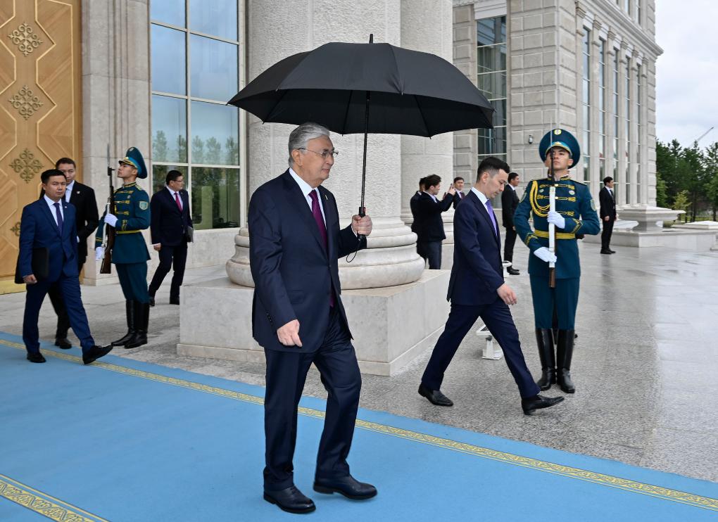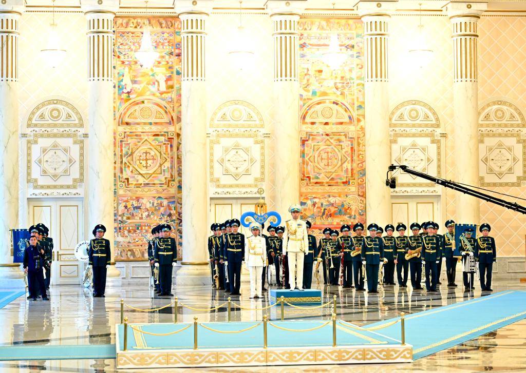 托卡耶夫?yàn)榱?xí)近平舉行隆重歡迎儀式??偨y(tǒng)府大廳氣勢恢宏,禮兵威武挺拔。兩國元首分別同對方陪同人員一一握手致意。兩國元首登上檢閱臺,軍樂團(tuán)奏中哈兩國國歌。習(xí)近平在托卡耶夫陪同下檢閱儀仗隊(duì)。