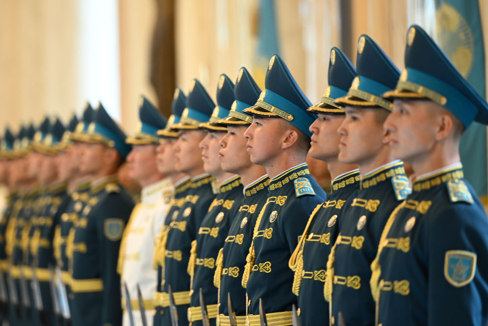 托卡耶夫為習(xí)近平舉行隆重歡迎儀式??偨y(tǒng)府大廳氣勢恢宏,禮兵威武挺拔。兩國元首分別同對方陪同人員一一握手致意。兩國元首登上檢閱臺,軍樂團(tuán)奏中哈兩國國歌。習(xí)近平在托卡耶夫陪同下檢閱儀仗隊。