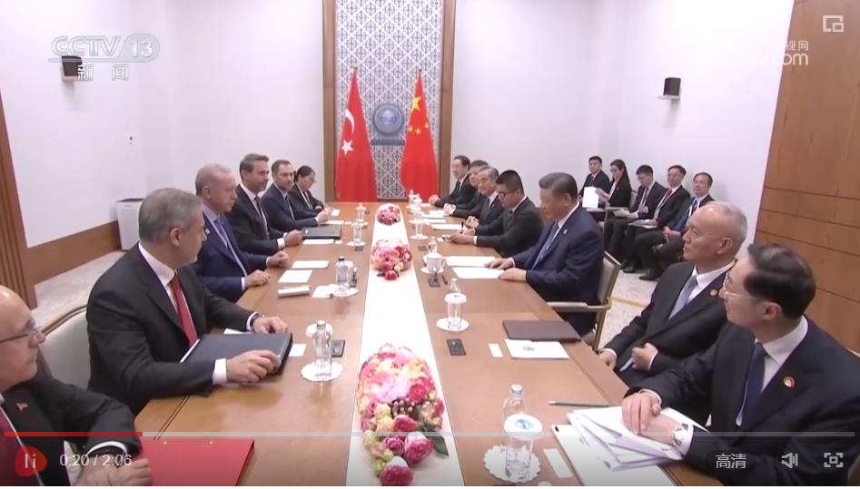 埃爾多安表示,土方高度重視發(fā)展對華關(guān)系,堅(jiān)定不移致力于推進(jìn)兩國各領(lǐng)域互利合作,堅(jiān)定不移恪守一個(gè)中國原則,尊重中國的主權(quán)和領(lǐng)土完整。中國是土耳其在世界和亞洲的最重要經(jīng)貿(mào)合作伙伴。土方歡迎更多中國企業(yè)赴土投資,歡迎更多中國游客赴土旅游,希望雙方進(jìn)一步加強(qiáng)共建“一帶一路”同土方發(fā)展戰(zhàn)略對接,擴(kuò)大經(jīng)貿(mào)、基礎(chǔ)設(shè)施、清潔能源等領(lǐng)域合作。土方贊賞中方為促進(jìn)世界和平作出重要貢獻(xiàn),包括在巴勒斯坦問題上秉持公平公正立場,希望同中方加強(qiáng)多邊溝通協(xié)作。