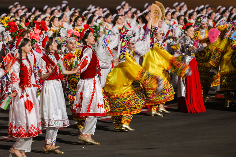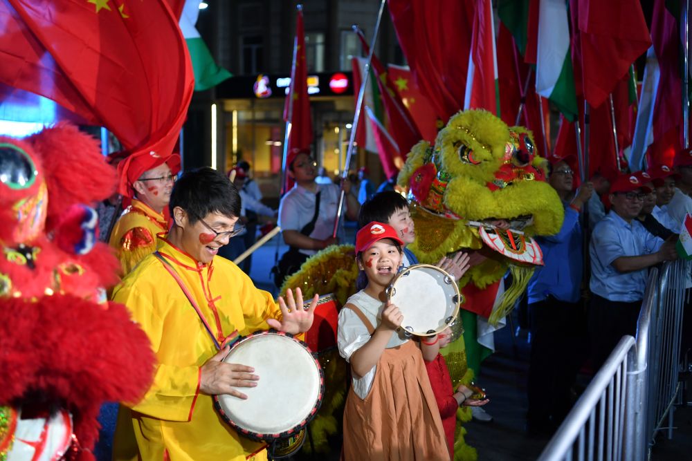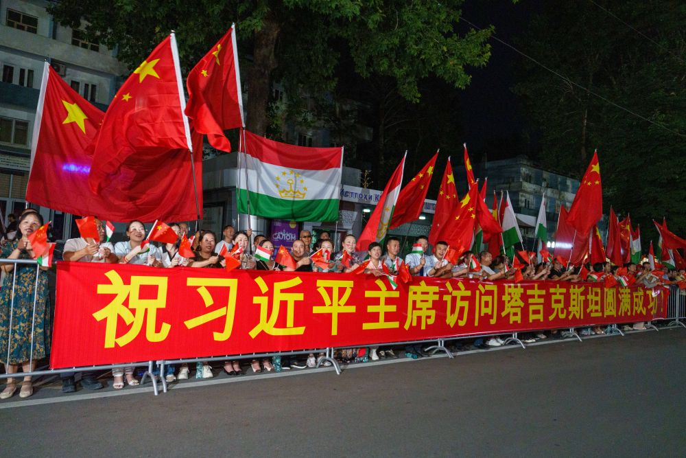 1500多名身著民族盛裝的塔吉克斯坦青年表演富有濃郁特色的中塔歌舞,揮舞中塔兩國國旗,表達(dá)對中國最尊貴客人的熱烈歡迎。