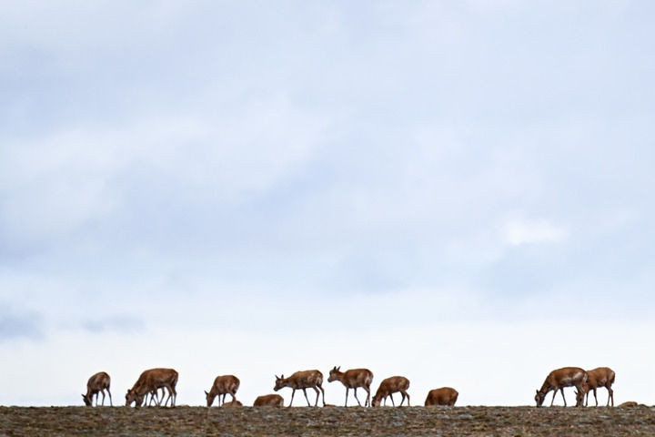 藏羚羊在青??煽晌骼镂宓懒旱貐^(qū)遷徙(2024年5月27日攝)。