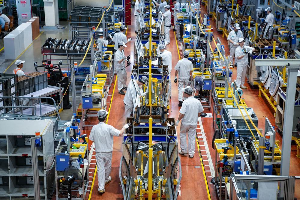 浙江湖州市長興經(jīng)濟技術開發(fā)區(qū)一家汽車部件公司,全自動機器人高速運轉(zhuǎn)生產(chǎn)新能源汽車配件。