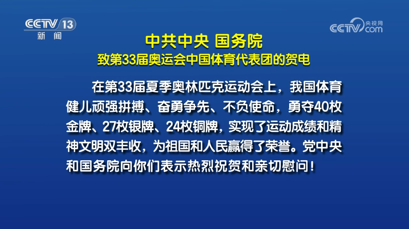 8月11日,中共中央、國(guó)務(wù)院向第33屆夏季奧運(yùn)會(huì)中國(guó)體育代表團(tuán)致賀電,高度評(píng)價(jià)我國(guó)體育健兒“實(shí)現(xiàn)了運(yùn)動(dòng)成績(jī)和精神文明雙豐收,為祖國(guó)和人民贏(yíng)得了榮譽(yù)”。賀電指出,我國(guó)體育健兒們以?xún)?yōu)異成績(jī)和出色表現(xiàn),進(jìn)一步激發(fā)了海內(nèi)外中華兒女的愛(ài)國(guó)熱情、振奮了民族精神、凝聚了奮進(jìn)力量。