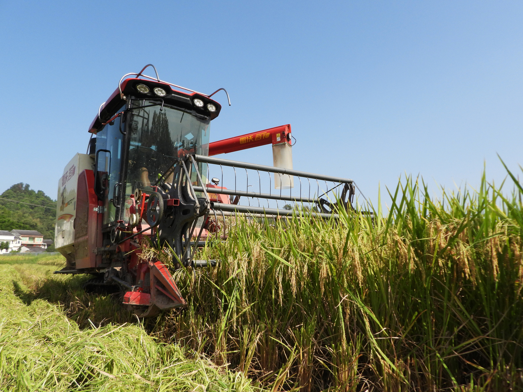 四川省達州市村民駕駛收割機收獲水稻