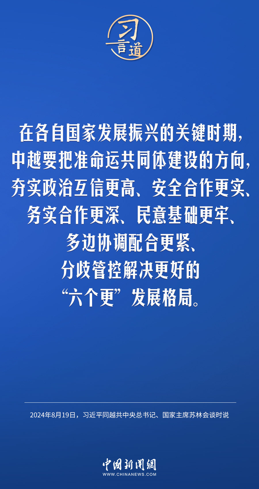 8月19日,中共中央總書記、國家主席習近平在北京人民大會堂同來華進行國事訪問的越共中央總書記、國家主席蘇林舉行會談。習近平指出——